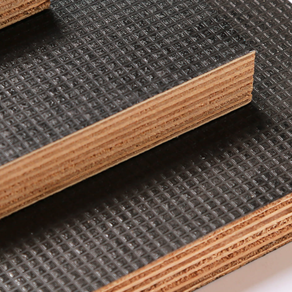 Tablero contrachapado de madera de Eucalipto, recubierto con una superficie antideslizante de papel con resina fenólica en una cara. En la contracara, papel film.