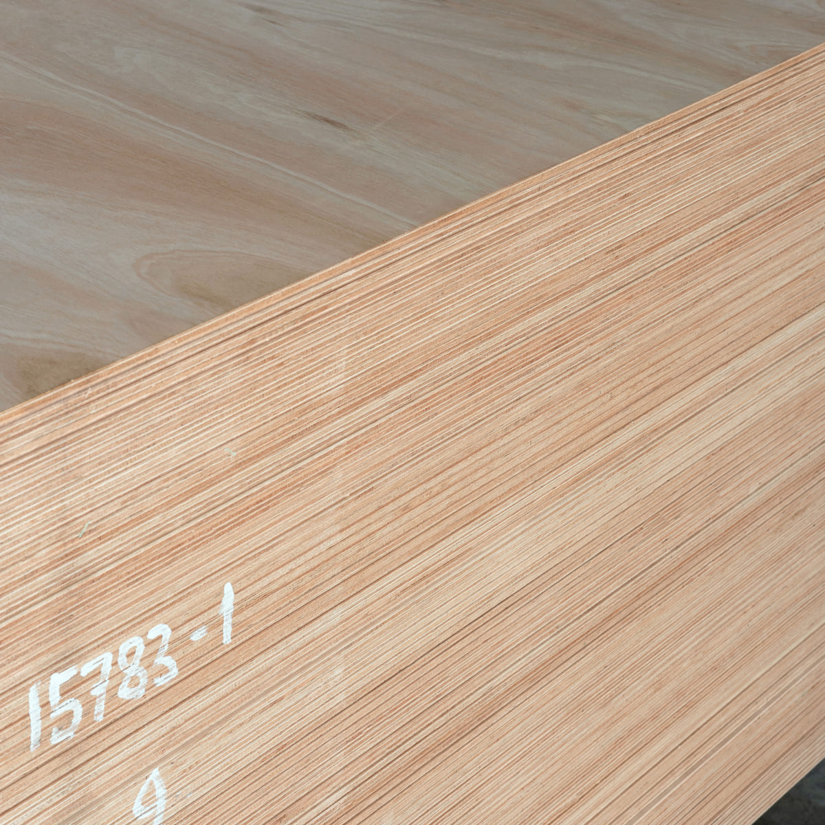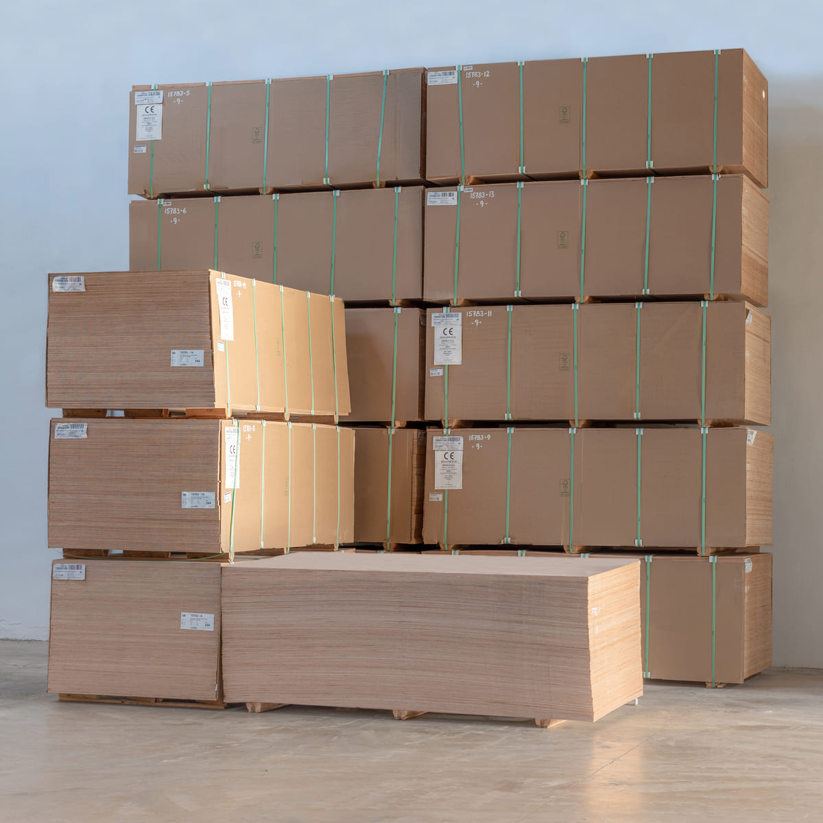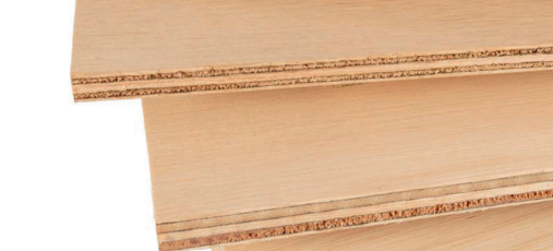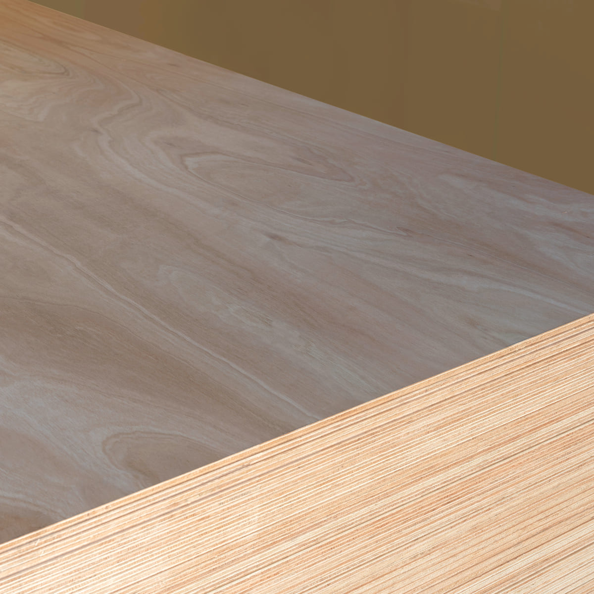 Tablero contrachapado fabricado íntegramente con chapas de eucalipto de bosques gestionados de forma responsable. Sus caras son de color rojizo claro.